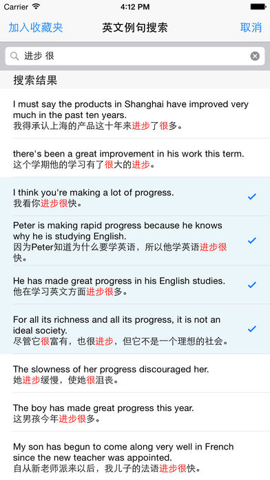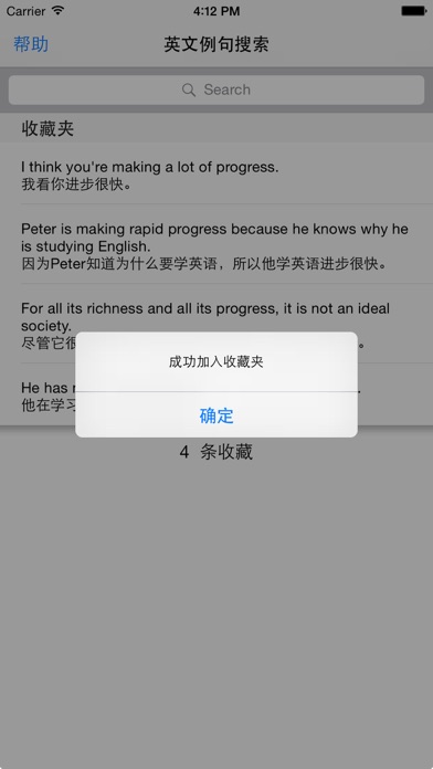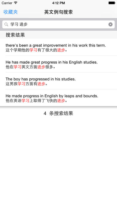 JuKu will help you to communicate in English accurately. JuKu built near 130,000 sentences, covering all types of situation, so you can search and study without internet anytime, anywhere. JuKu supports for Favorites feature, you can search the sentence to add to Favorites. It's convenience of learning and memory. If you are learning Chinese, JuKu would be very helpful. You can use it to inquirie Chinese sentence. ============================= 英汉句库致力于随时随地解决您在用英语交流和表达中遇到的问题。英汉句库内置近十三万条中英文例句,涵盖各类应用场合,让您无需上网即可随时随地查询和学习。 英汉句库支持模糊查询,您不必输入完整的句子,只需输入若干关键词即可。同时,英汉句库支持收藏夹功能,您可以将搜索到的句子加入到收藏夹中,方便学习和记忆。 ============================= 英漢句庫致力於隨時隨地解決您在用英語交流和表達中遇到的問題。英漢句庫內置近十三萬條中英文例句,涵蓋各類應用場合,讓您無需上網即可隨時隨地查詢和學習。 英漢句庫支持模糊查詢,您不必輸入完整的句子,只需輸入若干關鍵詞即可。同時,英漢句庫支持收藏夾功能,您可以將搜索到的句子加入到收藏夾中,方便學習和記憶。 如果要使用繁體例句庫,請先將系統語句切換至繁體中文或將使用者地區改為香港台灣。 Keywords/Tag: 中英文例句 / 英文例句查询 / 英语例句查询 / 英语例句 / 英文例句 / 背单词 / 记单词 / 学英语