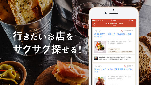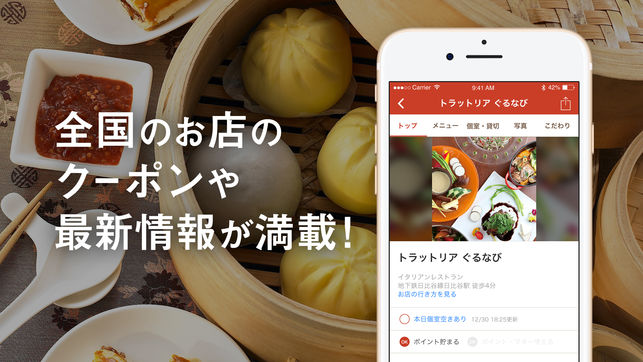 ■ぐるなびアプリの主な機能 1) ぐるなび会員情報・保有ポイントの確認 2)飲食店の検索 ・今すぐ飲めるお店を探す「イマノモ!」 ・エリアから探す ・駅から探す ・現在地周辺から探す ・特集から探す ・ランチのあるお店を探す ・ネット予約できるお店を探す 3)お店の詳細情報 設備やサービスなどの詳しい情報やお店がこだわっているポイント、画像などからお気に入りのお店を見つけることができます。 左右のスワイプでのページ切り替えや、画像の拡大などにも対応しより見やすく生まれ変わっています。 4)お店のこだわり 「直送天然地魚」「ゆったり寛げるダイニング席」など、食材や雰囲気などのお店のウリ情報…