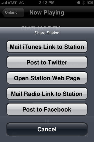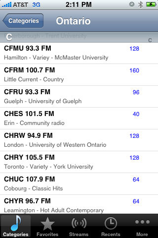 Listen to over 140 Canadian radio stations! Now with Twitter and Facebook support: tell your friends what radio station you're listening to, live, without stopping your audio to invoke an external Twitter or Facebook client! Dynamic directory provides for adding new directories and stations from our servers with no need for an application update. Select your station by country or add your own favorite stream. You can also pick from your favorites or your recently played stations. You can even share with your friends iTunes and Radio links to a station stream using your iPhone or iPod Touch Mail application. And you can also post your favorite stations directly to Twitter or Facebook.