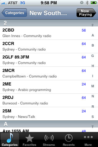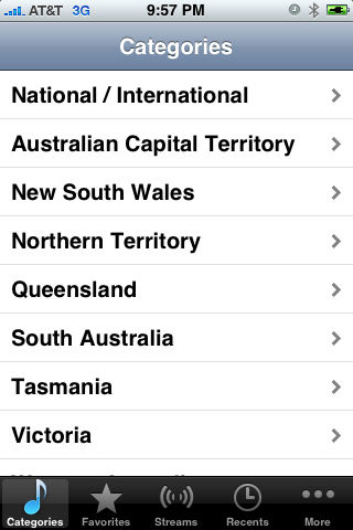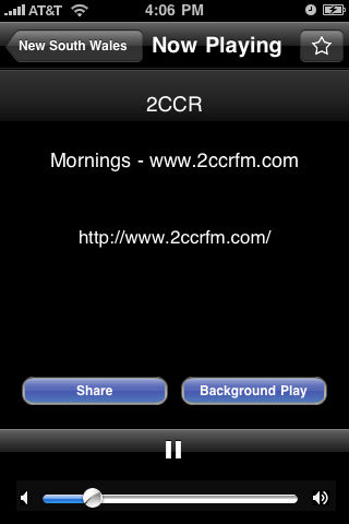 Now with Background Play! Listen to over 100 Australian radio stations! Now with Twitter and Facebook support: tell your friends what radio station you're listening to, live, without stopping your audio to invoke an external Twitter or Facebook client! Dynamic directory provides for adding new directories and stations from our servers with no need for an application update. Select your station by country or add your own favorite stream. You can also pick from your favorites or your recently played stations. You can even share with your friends iTunes and Radio links to a station stream using your iPhone or iPod Touch Mail application. And you can also post your favorite links directly to Twitter.