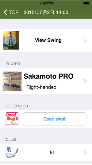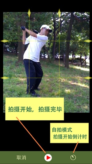 利用iPhone轻松检查您的高尔夫挥杆动作姿势! 自拍定时功能可使您独自一人完成挥杆拍摄! 【操作方法】 1、【拍摄方法】 拍摄方法1 选择相机模式,按中央红色“拍摄开始按钮”开始拍摄(此时会有“Quiet Please『请安静』”的伴音响起);按“拍摄停止按钮”停止拍摄(此时会有观众鼓掌欢呼声伴音响起)。 停止拍摄、图片自动保存后,可重新拍摄24张图片(拍摄时长约3-4秒)。 挥杆者可集中精力挥杆而不必在意相机。 - 请好友帮助拍摄。 - 自拍时,用球杆等物品将iPhone托垫并固定,保持相机稳定。 - 参照高尔夫杂志中刊载的挥杆动作图例,从挥杆者的正前方或后方等多个角度进行拍摄。…