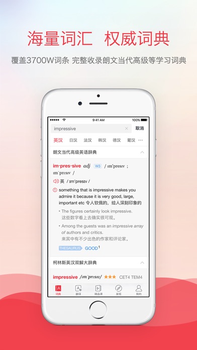 有道词典是网易旗下网易有道公司出品的英语、日语、韩语、法语、德语、西班牙语、葡萄牙语、俄语、藏语免费全能翻译软件,2016年用户突破6亿大关。 网易有道词典的在线翻译、语音翻译、拍照翻译、离线翻译等功能受到广大用户追捧,有道词典不仅是随身翻译器,更是功能强大的超级翻译词典,让你在学习、工作、生活中轻松搞定外语翻译。 借助优秀的翻译功能,有道词典曾获App Store首页推荐,长期位居App Store参考榜首位,2015年获【中国教育行业影响力APP】、【新浪教育盛典2015教育创新APP产品】等各项教育领域殊荣。 【产品简介】 支持中文、英语、日语、韩语、法语、德语、西班牙语、葡萄牙语、俄语、藏语等多语种翻译,在线翻译离线翻译均可满足,更有拍照翻译极大的提升了操作速度。 海量词汇:内置超过65万条英汉词汇,超过59万条汉英翻译词汇,2300万海量翻译例句。 权威背书:完整收录《朗文当代高级英语辞典》、《柯林斯COBUILD高级英汉双解词典》以及《21世纪大英汉词典》,权威翻译工具词典,满足用户查词翻译需求。 网络释义:独创“网络释义”功能,轻松囊括互联网上的时尚流行热词,永不out,情景翻译更加容易理解。 中英百科:聚合维基百科、百度百科内容,囊括2000W百科词条。 语音翻译:便捷的语音翻译,即说即译,让翻译更加简单。 拍照翻译:支持多种输入方式,独创“摄像头查词”功能,无需输入也能查单词。 日语词典:75万日中、中日词汇,海量中文日语双语例句,强大的日语发音功能。提供日语专属的手写输入检索、日语罗马音检索功能,不会日语、没有日语输入法也能轻松查询。还有人气日语课程,快速入门。 离线翻译:海量离线词库,没有网络身在国外也能快捷查词。 地道发音:支持单词、例句发音、全球发音,体验纯正英语发音。 发现频道:涵盖口语、在线课程、单词本等丰富学习内容,不止是翻译这么简单。 【覆盖场景】 学习——随时随地为你展示来自权威词典的翻译注释,以及来自网络的新鲜丰富例句翻译,同时提供商务英语、四六级、考研、GRE、托福、雅思、初中、高中等多种语言翻译学习类型,提供中文、英语、日语、韩语、法语、德语、西班牙语、葡萄牙语、俄语、藏语等多语种在线离线翻译。还有单词本版块运用科学方法帮你记单词,让你体验最适合的外语学习翻译方式。内置有道精品课,你不是一个人在战斗,轻轻松松学外语。 工作——在线翻译及拍照翻译能够快速准确的为你解决工作中遇到的英语难题,邮件文档中遇到外语词汇看不懂?使用拍照翻译功能,轻松搞定。遇到这么合适的翻译工具工作效率也成倍的提高。 生活——学英语不是一天两天的事,随手可及的在线翻译让你从一点一滴掌握英语、日语等场景,拍照翻译更是方便图片路标菜单等信息的了解。首页“每日一句”用美图配合中英释义让你每一天都有新体验、“看天下”涵盖了社交、翻译、购物、科技、视频、美剧、娱乐、健康等丰富内容,带你了解关于外语翻译的那些事儿。 考试——增加四六级、考研、托福、雅思、GRE英语学习词典,帮助考试人群快速提升词汇量。 【联系我们】 微信:dictyoudao 官方网站:http://dict.youdao.com/ 官方微博:http://weibo.com/youdaocidian