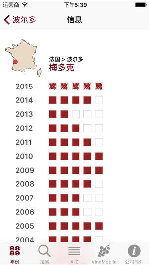 VinoMobile®“年份”应用程序共包括直到2015年的约5000个年份评价! 国家(130个葡萄酒产区) ----------------- 法国、意大利、西班牙、葡萄牙、德国、奥地利、瑞士、美国、阿根廷、智利、南非、澳大利亚、新西兰 年份: ------- 从1912年:最佳波特 从1945年:最佳波尔多 从1980年:其它大多数葡萄酒产区 …直至2017年(2017=预测) 评价总数: ------- 5'000 查找: ------- 您不太了解邦多勒、查理曼或是弗拉斯卡蒂源自哪个产区?直接从约550个索引中选择葡萄酒产地。您将会被引领向确切的产区(比如:邦多勒->普罗旺…
