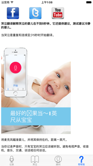 现在,你可以很容易地找出你的宝宝需要与Cry翻译器。这个获奖的程序可靠地分析和诊断您的宝宝的哭泣,然后推荐有用的解决方案 - 所有在不到5秒钟!你的宝宝饿了,困了,懊恼,强调还是无聊? Cry翻译器会告诉你。点击“...更多”,了解为什么你应该下载这个应用程序今天! - 2010年日内瓦发明奖获得金奖 - 我喜欢它 !一个伟大的帮助! “Cry翻译使父母更容易。这就像我们儿子的祖母在那里,当他哭泣时帮助。哭泣翻译也帮助我的丈夫成为一个更溺爱的父亲。有了这个程序,我们都更放松,所以我们可以平静我们的婴儿快速。因此,我们发现我们的儿子哭了。和平已经回到我们的家! (...) 妈妈帕蒂…
