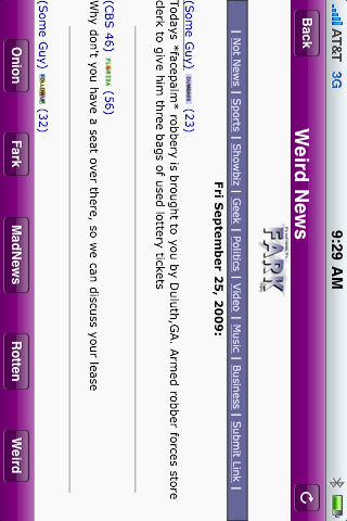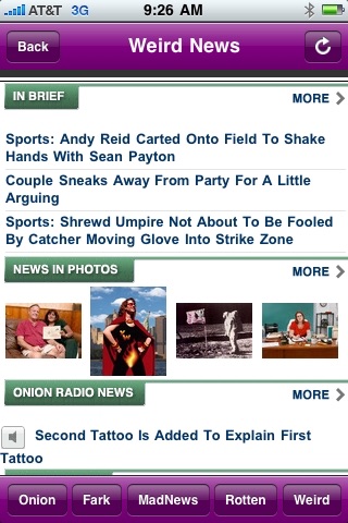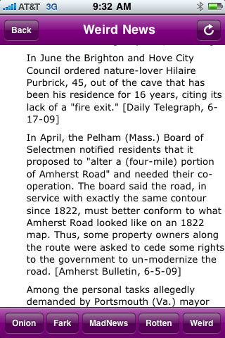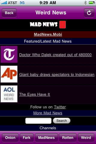 Weird News is an app that give you quick access to the latest weird, silly, humorous and bizarre news. Most content is optimized for the iPhone and professionally designed. Gives you quick access to news from the following: Ayslum - strange news articles Rotten History - Bizarre and silly news stores of events that happened on today's date in prior years. The Onion - Satirical News Stories that look real FARK - is a community site where users submit links to funny, bizarre or interesting content on the web. The FARK PDA site has all the same links and one line descriptions with tags as the full site in a simplified mobile (and ad free ) format. News of the Weird - Chuck Shepherd's weekly News of the Weird newspaper column, which for 21 years has been the gold standard in reporting the bizarre and the ridiculous. Features: - Supports landscape mode for easy reading - Shake to set the default page to show when launched. - Displays Activity Indicator to let you know when a page is loading - Fast loading - Small size - Updates are Free! Requirements: - Internet connection Website: www.quikiphoneproducts.com Follow us on Twitter for promos/giveaways: twitter.com/quikiphoneprods