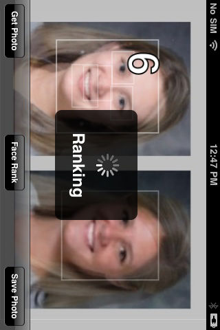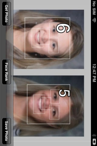 THIS APPLICATION RANKS HUMAN FACES FROM 0 TO 10 (MOST AESTHETICALLY PLEASING). It uses computer vision (OpenCV) to automatically recognize human faces & features in photographs taken from the camera or the photo library. The faces are measured and scored: 50% of the score is calculated based on the Golden Ratio criteria and the other 50% is by comparison with census. HOW TO USE 1) Press 'Use Photo' to select a photo from your the photo library or take a new photo using the camera. 2) Press 'Face Rank' to start processing the photo. 3) A ranking number appears next to each face. For better performance, please take note of the following conditions : - The photo should also show the head of the person and not only just the face. - The face should be at least 50x50 pixels. (The human faces in this application are computer-generated composites, any resemblance is purely coincidental.)