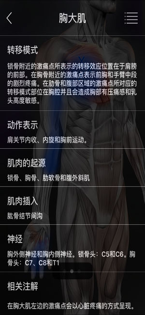 这个参考资料是有关超过75块人体肌肉上常见的激痛点和转移模式的资讯,其特色在于108个激痛点和其所对应的转移疼痛模式。每个肌肉包括其可视的转移模式部位和点定位,外加对肌肉动作的描述、转移模式和肌肉的相关评论。你可以选择单独观看每块肌肉,或者选择观看分区图来确认和所有肌肉相关的特定区域,这都可以帮忙找寻疼痛的来源。 激痛点分部在全身并且紧临在肌肉上,所以会让全身都感觉到疼痛。这对按摩治疗师、物理治疗师、脊医和任何想要寻找疼痛来源的人,并且想要了解肌肉功能的相关资讯是很有用的工具。 寻找两星期内高人气有特色的苹果软件。