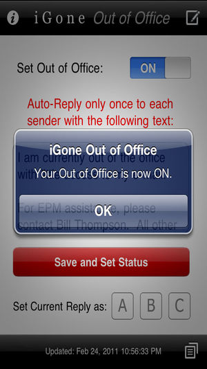 *** iGone is the most popular Out of Office app in the App Store! *** Forgot to set your Out of Office on while your away from your desk? Don't worry! This small little app gives you the ability to login to your Outlook Web Access account and set your Out of Office status to On or Off. iGone Out o…