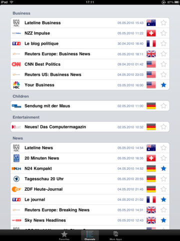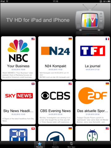 TV HD converts your iPad, iPhone or your iPod touch to an mobile Wifi television. Whenever and wherever you want, completely independent from any broadcasting times, TV HD keeps you up to date. TV HD offers you actual and important shows in following categories: News, Sports, Business, Entertainment, Chrildren und Weather. Broadcasts from following countries are supported until now: Germany, USA, UK, France, Swiss, Australia. We are continuously exerted in keeping content up to date and allocate new channels and shows. Please feel free to send us reviews, any request for changes or requests for new channels or shows (info@i-app.net). Disclaimer: When you have select a video you'll be linked to the original server on which the content is provided. This content could also be viewed with iTunes or YouTube. We're only providing a link collection.The content may vary and channels or shows may be deleted without any notice. If any channel or show couldn't be provided any longer, you're not approved to restore the app.