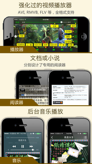 √ iPhone版发布初始收费版/免费版同时登顶中国区效率类第一! √ 长期保持在多个国家销售榜单前十! √ 获得几十个国家的“热门产品推荐”和“新品推荐”! 您是否在为您的手机不能自由传输文件而烦恼?您是否希望在您的手机上方便的查看您的文档和图片?您是否不希望您的某些文件被别人看到?您是否希望通过WIFI无线上传视频或音乐到您的手机?『无线u盘』可以帮您解决这些问题!它可以让您的手机变为一个文件管理器,并且您可以在手机中查看它们! 关键功能: - 多种传输方式!不但可以通过WiFi和USB传输文件,还可以与Dropbox,iDisk(MobileMe),GoogleDocs,myDis…