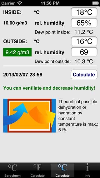 Das Programm VentilateClever wurde unter iOS 5.1 entwickelt und mit iPhone und iPad getestet. Messgerät für Temperatur und Luftfeuchtigkeit Beachten Sie, dass für die Nutzung dieses Programmes ein Messgerät nötig ist, welches die Temperatur und die Luftfeuchtigkeit jeweils im Gebäude und ausserhalb messen kann. Ideal ist ein Gerät mit einem via Funk verbundenen Aussensensor, der sich geschützt vor Regen im Schatten befindet. Die Messgenauigkeit sinkt bei sehr hohen Luftfeuchtigkeitswerten. Manchmal differieren Innen- und Aussensensor selbst unter exakt den gleichen Bedingungen. Daher empfiehlt es sich, die Werte auf- bzw. abzurunden. Das Programm berechnet die Luftfeuchtigkeit zwar auch für die erste Dezimale der Temperatur durch eine Annäherung recht genau, doch lassen Sie sich dadurch nicht täuschen. Die Messtoleranz Ihres Gerätes ist wahrscheinlich höher als ± 1% Luftfeuchtigkeit. Die Messgenauigkeit bei der Temperaturmesseung dürfte hingegen ± 0.2 °C betragen. Temperaturbereich Mit dem Programm lässt sich aus der relativen Luftfeuchtigkeit für den Temperaturbereich von -10°C bis 35 °C berechnen. Das dürfte die Bedürfnisse der meisten Anwender abdecken. Das Programm führt die Berechnung auch in °Fahrenheit durch. Die Bedienung erfolgt dann in englischer Sprache. Taupunkt Seit Version 2.0 wird für innen und aussen je der Taupunkt berechnet. Das ist jene Temperatur, bei der Kondensation eintritt. Die Werte sind mit Hilfe einer Annäherungsformel berechnet, die sowohl über 0°C als auch unter 0°C eine Abweichung von ledilgich ± 0.1°C ergeben. Es hat übrigens bei der Messgenauigkeit der Geräte keinen Sinn, zwei Dezimalstellen anzugeben. Es wird empfohlen auf die ganzzahlige Temperatur aufzurunden. Dann ist man auf der sicheren Seite. Es wird empfohlen, Malarbeiten mindestens drei Grad über dem Taupunkt auszuführen. Hauptanwendungsbereich: historische Gebäude, Kirchen etc. Die hier empfohlene Vorgehensweise hat sich vor allem bei historischen Gebäuden, z.B. Kirchen mit dicken Mauern bewährt. Die Raumtemperatur bleibt durch das Mauerwerk auch beim Lüften relativ stabil, so dass der durch die Applikation berechnete Entfeuchtungseffekt bis zu einem gewissen Grad erreicht werden kann. Holzhäuser haben hingegen eine andere Charakteristik. Sie passen sich der Umgebungstemperatur viel schneller an. Hier ist es wichtig, mit Hilfe dieses Programmes Erfahrungen zu sammeln und diese beim Lüften zu berücksichtigen. Jedes Gebäude hat eine eigene Charakteristik und kann je nach der Beschaffenheit des Mobiliars, der Böden und der Decken in gewissem Mass Feuchtigkeit speichern und wieder abgeben. Nach dem Lüften kann sich die Luftfeuchtigkeit dadurch wieder leicht erhöhen. Was sonst noch zu beachten ist Beachten Sie auch, dass bei einer grossen Temperaturdifferenz, z.B. im Winter aus Energiespargründen nur kurz gelüftet werden sollte. Während im Winter die Luftfeuchtigkeit innen eher zu gering ist, ist sie im Sommer eher zu hoch. Anzustreben ist ein Bereich von 50 bis maximal 70% relative Luftfeuchtigkeit. Nicht immer lässt sich die Luftfeuchtigkeit allein durch Lüften im gewünschten Bereich halten. In gut geheizten Räumen kann im Winter oft eine rel. Luftfeuchtigkeit von 50% nur mit einem Luftbefeuchter erzielt werden. Umgekehrt ist es im Sommer bei längeren Regenperioden nötig, einen Entfeuchter einzusetzen, um nicht über 70% zu kommen. Wird allerdings clever gelüftet, kann bei grossen Gebäuden oft durch 30 min. intensives Lüften ein grösserer Effekt erzielt werden, als durch den stundenlangen Betrieb eines Entfeuchters. Ab 70% Luftfeuchtigkeit kann sich Schimmel bilden. Am Schädlichsten sind jene Situationen, bei denen warme Luft an kalten Wänden Kondensate bildet. Das ist der Fall, wenn die Temperatur der Wand der Taupunkttemperatur entspricht oder sie unterschreitet. Das Programm weist Sie u.U. auf entsprechende Gefahren hin.