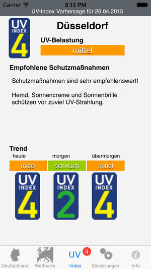 *** UV Index in Deutschland, ab V1.2 auch mit Weltkarte *** Möchten Sie den UV-Index im Blick behalten damit Sie wissen wie hoch heute die UV-Belastung ist? Mit UV-Index bleiben Sie informiert. Die Applikation zeigt die Vorhersage des UV-Index ausgegeben vom Deutschen Wetter Dienst (DWD) für ausge…