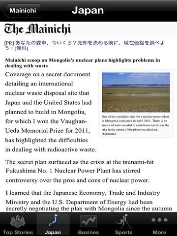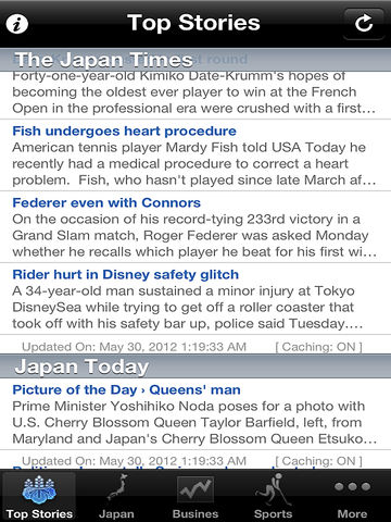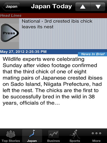 Japan News, In English is a very simple RSS e-news reader for the people of Japan. This app brings you the latest news from all the top Japan news sources The app reads the news headlines and stories and places them into scrollable list. When a headline is selected, a full screen window opens with the cover story. This new window also holds up and down arrow to browse all the news. It contains Full News button which displays full news content on the same window and Safari Button which opens the news in safari browser.