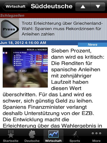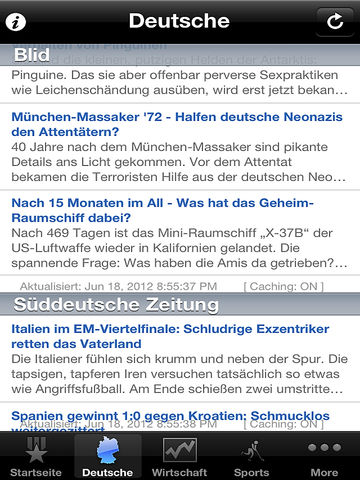 German News, de Deutsch Online is a very simple e-news reader for the people of Germany This app brings you the latest news from all the top Germany news sources The app reads the news headlines and stories and places them into scrollable list. When a headline is selected, a full screen window opens with the cover story. This new window also holds up and down arrow to browse all the news. It contains Full News button and Email news article button > Offline Caching of News (Works with out internet connection) > Emailing of news articles > Customized news table view > iOS 4.0 & iPad Compatibility > Supports both RSS & Atom feeds > Portrait & Landscape orientation