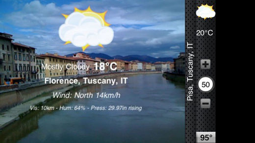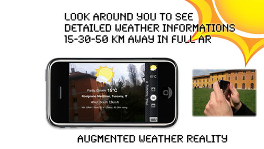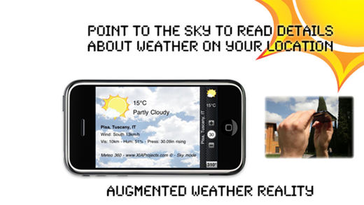 气象局360让你看到你的位置(使用全球定位系统),以及你周围的检查15-30-50公里外的天气。 Watch here: http://www.youtube.com/watch?v=wPDlQarzNPc Meteo360 lets you see the weather on your location (using GPS) and check also around you 15-30-50 km away. - All Cities Supported! - No configuration needed! - Full Augmented Reality support for 3Gs - 3G, iPod Touch, 2G supported with Compass Simulation The application has three modes of operation “flat”, “sky” & “360°”. - In flat mode, the iPhone is positioned horizontally, it displays your location on a map, weather in cardinal directions on a mobile compass. - Pointing to the sky you can see the current weather on your location (using GPS on your iPhone). - In 360° mode, which is activated in upright position the device, enter in augmented reality mode. This allows you, pointing the device in any direction, to get the weather information at a distance of 15 km. It supported to expand view to 30km and 60km by icons on right bar. We provide iPad version of Meteo360 on Meteo360 for iPad.