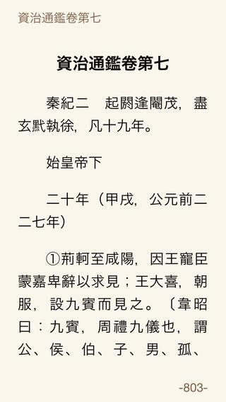**更多古典图书,请搜索“古典书城”。** 此程序包括简繁体版本。 胡三省所撰《通鉴音注》的体例演变,大体分为两个过程:先是按唐陆德明《经典 释文》的体例,写成《广注》、《通论》、《辨误》三书;稿轶重撰时,总成为《资治通鉴音注》。此书对《通鉴》记载的有关典章制度、音韵训诂都有详细注释,特别是对音训、地理诸项,考证尤为精详,订谬殊多。古代对于《通鉴》的注释,卷帙浩繁,历来以此书声价最高,是目前研究《通鉴学》最完整的参考资料。 胡三省(1230~1302)(其中“省”读xing三声),中国宋元之际史学家。字身之。台州宁海(今浙江宁海)人。自宝祐四年(1256)开始专心著述《资治通鉴广注》,得97卷,论10篇。临安(今浙江杭州)失陷后,手稿在流亡新昌(今浙江新昌)途中散失。宋亡后,重新撰写。元世祖至元二十二年(1285)完成《资治通鉴音注》294卷及《释文辩误》(12卷),对《通鉴》作校勘、考证、解释,对《释文》作辩误,并对史事有所评论。 **联系我们** 新浪微博:weibo.com/gudianshucheng 腾讯微博:t.qq.com/gudianshucheng 微信:gudianshucheng 邮件反馈:gudianshucheng@feetan.cn **更多飞螳科技资讯,请登录www.feetan.com