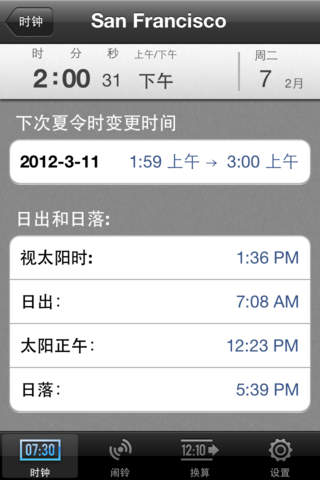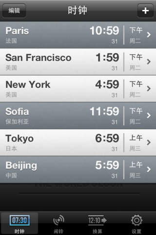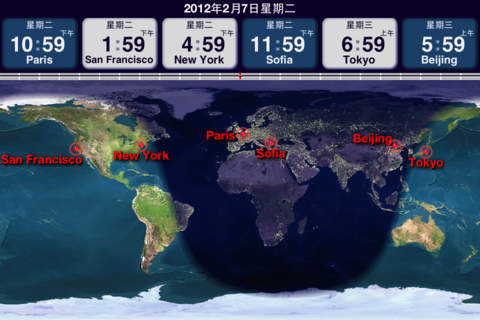 **** Featured By Apple in staff favorites in US and 92 countries - Best World Clock app **** 世界时钟是同类软件中最强大的一个。它提供时间换算,闹钟,通知功能,来自超过230个国家的超过192000个位置,网络时间同步,关于夏令时变更的详细信息以及更多。 主要特色: • 支持iPhone,iPod和iPad • 漂亮的有实时日夜显示的世界地图(在iPhone和iPod touch上需要切换到时钟标签,并且需要横屏模式) • 精确到秒以内的网络时间同步(需要3G或WiFi网络连接) • 自动通过网络更新时区信息 • 闹钟和警报功能,提供多个时区和夏令时自动变更支持 • 可自定义的懒人模式(小睡一下)时间(2-15分钟) • 可以卷动的地图使得世界时钟成为一个互动的、不同时区间的时间换算器。• 会议安排窗口可以显示每个地区的详细时间信息。您还可以使用超过40个常用的时区缩写(例如PST, EST等)。 • 显示1到24个时钟 • 选择的地点将在地图上显示 • 位置名称可自定义 • 自定义地图中心 • 使用工业标准的夏令时算法和数据库 • 数据库中包含世界上超过230个国家的超过192000个位置 • 通过输入城市名称来查找,支持当地的拼写方式 *** 仅适用于iPad*** • 9种不同的时钟皮肤 – 5个模拟时钟和4个数字时钟 • 钟面可以根据用户选择的规则改变明暗: - 白天(日出之后)使用浅色,夜晚(日落之后)使用深色 - 工作时间使用浅色 - 正午之前使用浅色,正午之后使用深色 - 其他选择,包括自定义时间段等。 • 全屏时钟界面 – 在屏幕上滑动一下即可显示/隐藏地图 • 可以在选择的钟表下方显示附加信息,例如在模拟时钟下方显示数字时间,GMT偏移,时差,星期,真太阳时,日出、太阳正午、日落时间等 • 内置帮助 • 自定义地图中心 • 使用工业标准的夏令时算法和数据库 • 数据库中包含世界上超过230个国家的超过192000个位置 • 通过输入城市名称来查找,支持当地的拼写方式 鸣谢: 高清地图是以美国宇航局 Visible Earth 工程为基础生成。 设计改进:Marcello Luppi, Wrinkly Pea Design