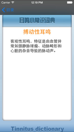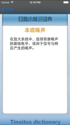 耳鸣小词典自从全球发行后备受欢迎,现在第二版也上线,只需$0.99便可获得一部专业的掌上词典。 耳鸣是影响人们生活和健康的主要疾病之一,其发病率高达20%,因此为了更好治疗耳鸣,重要的是需要了解耳鸣发病的常识,检测和各种治疗方案。这本独创的耳鸣常识小词典,包揽目前所有的关于耳鸣信息和常用术语,是了解耳鸣的小助手!本词典包括: 耳鸣定义 耳鸣检测方法 耳鸣分类 耳鸣发病率 耳鸣治疗方法 耳鸣治疗效果评估 测试耳鸣设备介绍 耳鸣发病原因 耳朵解剖结构 听力学常识 听力检…
