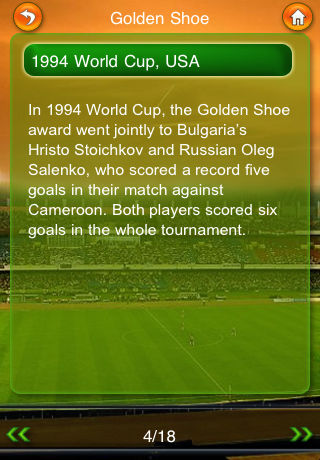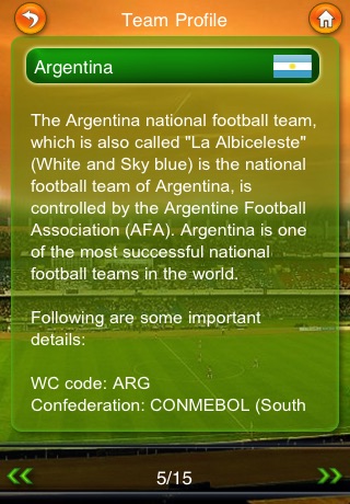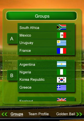 The 2010 World Cup soccer craze is now on!!! So are you ready to move by the soccer thrill? The players are ready, so should the fans be. With the Soccer World Cup 2010 get ready to spread the World Cup fever across the Globe. The application will help you to stay connected with World Cup info from teams to winners on the move. Join the fun and adventure and enjoy it full speed ahead with Soccer World Cup 2010. Get ready to kick the boredom! Features: - Get familiar with Teams & Groups. - Checkout your favorite Team Profile. - Know Golden Ball and Golden Shoe Winners. - Find Young Player Award winners. - Unwind the mystery of previous World Cups.