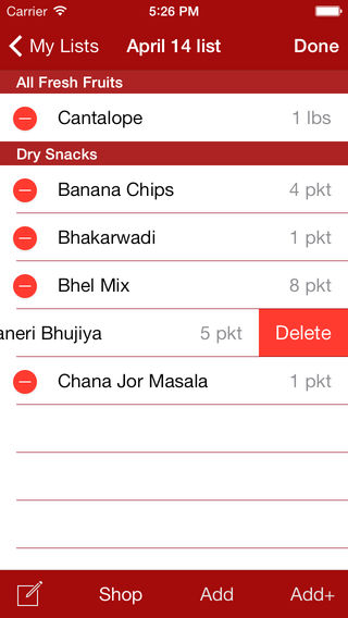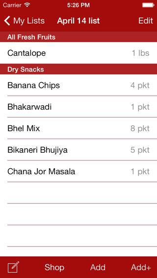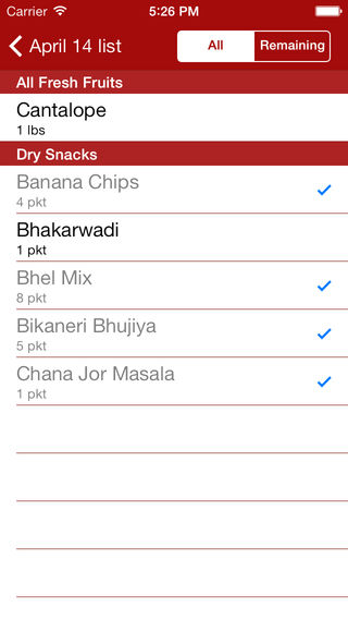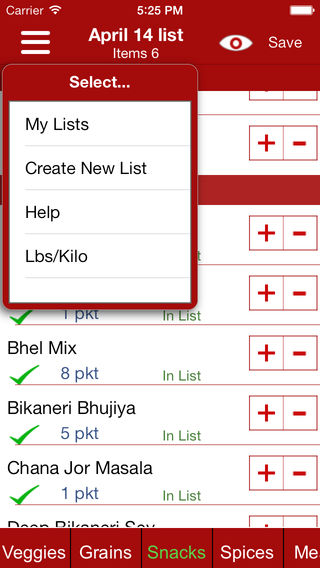 Desi Grocery is the application for Indian Grocery Shopping list. The application database contains more than 1000+ items in 8 categories including Veggies, Grains, Snacks, Spices, Meals, Pickles, Sweets and Misc. available at your local Indian grocery stores. This application allows user to create and save shopping lists using items in the database on Iphone/IPod Touch and shop using those lists. Key Features: 1. Items in 8 categories for easy navigation and selection. 2. Create your own shopping list. 3. Change the quantity of items. 4. Quick view feature to glance the list 5. Email Shopping list. 6. Shop using lists. 7. Add custom items (items not available in database) in the Shopping list. 8. Choose to switch the weight in Pounds(lbs) or Kilograms. 9. Search an item.