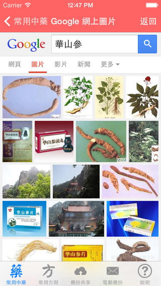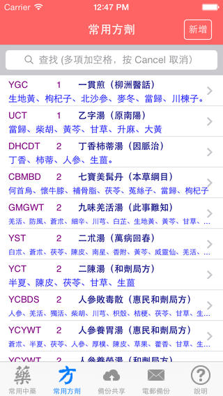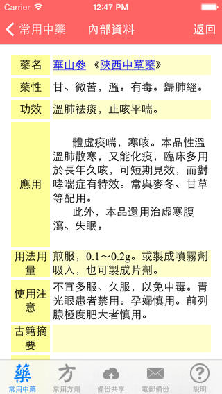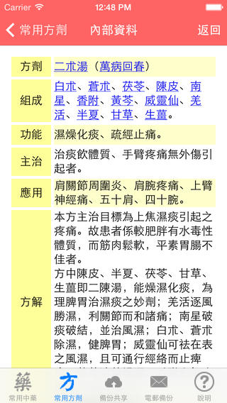 常用中藥及方劑速查 *可以修改的電子書* (繁體中文版) --------------------------------------- 內部收錄常用中藥資料470多條,常用方劑270多條。可自由加入,刪除,修改及快速地查找中藥及方劑資料,讓你建立個人化的資料表。沒有網絡連接也能使用。如內部沒有資料,更會自動連網查找。 ***** 注意:中藥及方劑速查【研習版】2016 經已推出***** https://itunes.apple.com/hk/app/zhong-yao-ji-fang-ji-su-cha/id1116858729 ***** 注意:中醫診所系統 2016 經已推出***** https://itunes.apple.com/hk/app/zhong-yi-zhen-suo-xi-tong/id1104742864 ***** 注意:中藥及方劑速查【加強版】經已推出***** http://itunes.apple.com/hk/app/zhong-yao-ji-fang-ji-su-cha/id521511036 ***** 注意:中醫處方系統【加強版】經已推出***** http://itunes.apple.com/hk/app/zhong-yi-chu-fang-xi-tong/id504789839 ************************************************** (簡体中文版請查找 *中药及方剂速查* ) (繁簡版處方系統請查找 *中醫處方系統*) 特點 -------------------------------- - 不用上網也能查找所有內部資料 - 不用輸入中文也能查找中藥及方劑 - 特有廣東話快碼查找。例如查“人參”,只需打 “YS” - 快碼可隨意更改。 - 可以用筆劃查找。打入“10”便可查閱10劃的中藥或方劑 - 也可以按名稱,分類,功效,主治,功能等等來查找 - 方劑內所有成份中藥也可以作個別查閱,不用再次查找 - 可隨意加入,更改,刪除內部中藥及方劑資料。 - 內部有超多連接,不用打字也可自動連接網絡查閱更多資料及圖片 - 可同時安裝於 iPhone, iPod 及 iPad - 可以上載及下載中藥及方劑資料到谷歌文件Google docs。 - 可以在 PC 上登入Google docs 修改資料,然後下載至 iPhone, iPod 及 iPad。方便統一 iPhone, iPod 及 iPad上的資料庫。 - 可以和朋友交流共享中藥及方劑資料。 - 多項資料查找功能,例如查含有人參,白朮及甘草的方劑,只需用空格分隔打入 “人參 白朮 甘草” - 加入郵件備份功能,解決國內用戶不能使用Google Docs備份的問題。用戶可以經由郵件備份,修改及還原備份。 - 加入“內部”查找項,用戶可查找所有應用、使用注意、古籍等等內部資料,例如可以查找 “高血壓”、“胃寒”、“五十肩”,等等相關的中藥或方劑資料。 免責條款 -------------------------------- 本軟件所有資料只供參考之用。 任何一切因使用本軟件而引致之任何損失,包括疏忽、意外、合約毀壞、誹謗、版權或知識產權侵犯及其所造成的損失,作者概不負責,亦不需承擔任何法律責任。 任何透過本軟件而連接及得到之資訊、產品及服務,作者概不負責 ,亦不負上任何法律責任 。