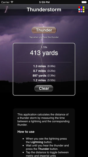 This application calculates the distance of a thunder storm by measuring the time between a lightning and the corresponding thunder. How to use: - When you see the lightning press the 'Lightning' button. - Wait until you hear the thunder and press the 'Thunder' button. - Tap the distance to toggle…