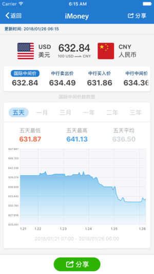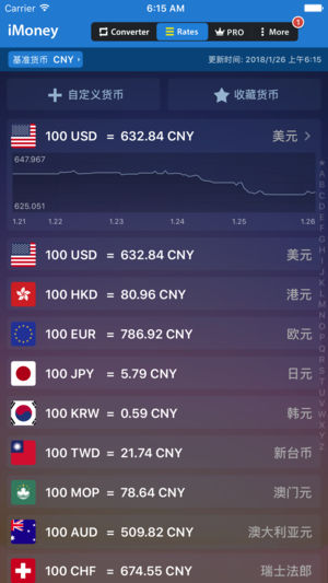 iMoney 是全球首款完整支持 iOS 11 以及 iPhone & iPad 的汇率计算软件,提供 170 多种常用货币支持,并提供最简易人性的操作体验。 =亮点= 1.同时支持 5 种货币兑换 * 2.170 种货币支持,并提供基准货币一览表 3.汇率历史图表,银行汇钞买卖牌价 4.汇率转换及货币牌价挂件,Spotlight 搜索,3D Touch 主屏图标快速选择货币 5.每日实时汇率推送,汇率计算历史,自定义货币,贵金属价格换算等进阶高级功能 6.支持 iPad & iPad Pro,以及 Slider Over 分屏功能 *根据屏幕尺寸可换算的数量会有区别 反馈合作事宜请发…