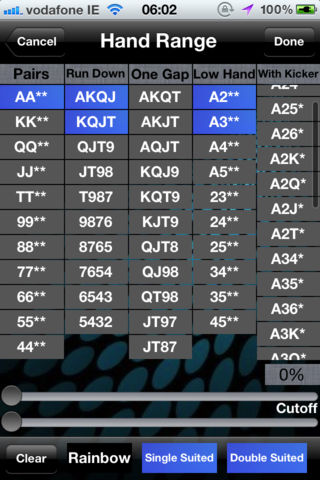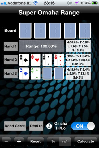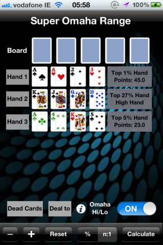 Have you ever been annoyed by the inaccurate results for the Omaha odds calculators in app store? Are you still looking for a reliable and serious app for your Omaha game? Do you even want something powerful as very popular pokerstove does on Hold’em? Now here it comes: Super Omaha Range, the most advanced and powerful Omaha calculator in the app store, for both Omaha and Omaha Hi/Lo! It is the only one that let you assign hands by specific cards, hand ranges or percentage slider. And you can even assign any number of cards in your hand(other cards are left random). Besides, you can get the information about hand types and equity breakdowns. The popular and useful features “deal to” is also available. By this, you can check the odds on every street. What’s more, there is a top hand checker, with which you can check how good is your starting hand, and which place it is in for both straight high and Hi/Lo game. With Hi/Lo, you can also using the Hutchinson Point System to evaluate your starting hands. And some usual features like dead cards setting and displaying by both percentage and ratio are included as well. Overall, this is the only app you need for Omaha(and Hi/lo of course). You can't head for a card room without it. And if you like it, please check the hold'em version: Super Poker Range. Features: -Calculate odds and equities for both Omaha and Omaha Hi/Lo games -Assign any number of cards in your hand (other cards are left random) -Assign hands by specific cards, a hand range or a percentage -Advanced optimistic algorithm offering high efficiency and accuracy -Full hand type and equity breakdown chart -Double direction hands sliders and separate ranges for different suit filters -Top hand checker for both Hi and Hi/Lo hands -Exclusive Hutchinson Point System Calculator -Deal to feature, let you check the odds on every single street -Multiple hands calculation, adding players as you want -Both percentage and ratio display -Dead cards setting -iOS 5 compatibility