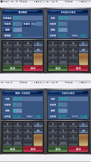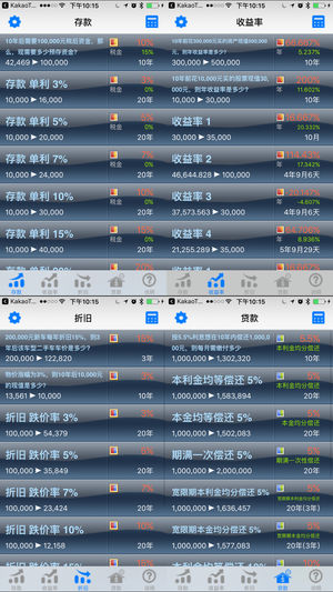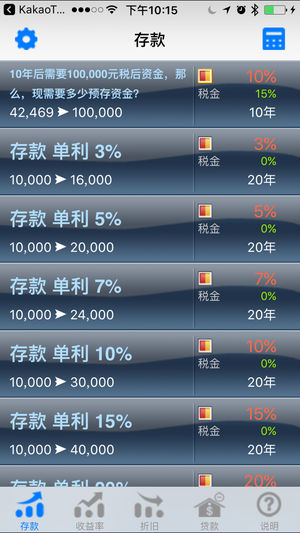 "复利是人类历史上最伟大的数学发明。" - 爱因斯坦 利用本计算器简便而直观的界面, 无需复杂的数学公式和术语知识, 任何人都可方便地进行以下计算。 1. 存款、整存整取'利息'(单利、年复利、月复利)计算 (含税) 2. 储蓄账户频繁的存取款年度'收益率'计算 3. 当前价值和'未来价值'的折旧计算 4. 贷款(5种) '总利息和月缴款'计算 —— 贷款利息的种类 —— 1. 本利金均分偿还 2. 本金均分偿还 3. 期满一次性偿还 4. 宽限期本利金均分偿还 5. 宽限期本金均分偿还 - 本计算器不仅仅具备单纯的利息计算功能。 请选择本金、利息率、期限、总额之一。…