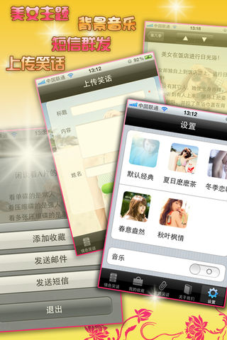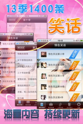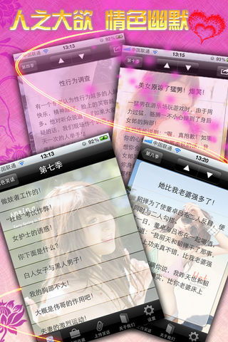 饮食男女,人之大欲。床第之间,帏帐之内,总有着说不完的趣事和笑料。激情刺激的“荤段子”,在为您带来欢笑的同时,也闪烁着幽默的智慧。“情色笑话”通过精心编辑,认真筛选,为您收集最新最全的经典情色笑话,保证让您欢乐开怀、捧腹大笑! ---------------------------------- “情色笑话”拥有五大特色: 1、每日更新笑话,用户开机即可与服务器同步下载; 2、如果您有好的笑话,可上传至“情色笑话”书库内与大家分享快乐; 3、目前已更新12季,其后每半月更新1季,每季至少100条笑话,新鲜笑话看不完; 4、若您阅读中喜欢某条笑话,可使用“收藏”功能,将该条笑话收藏到“我的收藏”中,方便您随时浏览。 5、支持邮件转发,短信发送功能,使您的快乐即刻与朋友分享。 appjourney微博平台全面开通,我们将在微博中开展各类活动,每位关注appjourney微博的用户均有机会赢得推广码! 新浪微博 http://t.sina.com.cn/2043635853 腾讯微博 http://t.qq.com/appjourney