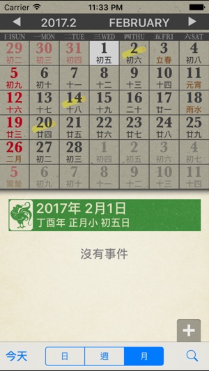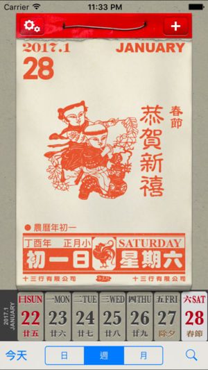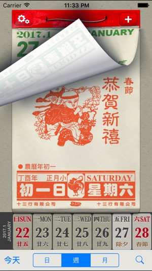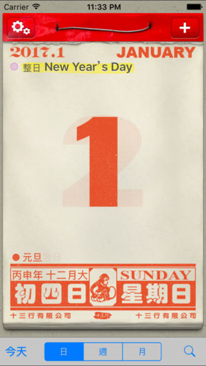 十三行「懷舊日曆」- 使用全新「懷舊」介面顯示日曆。 功能特色: ‧ 與 iPhone 行事曆同步,可直接 顯示/增加/刪除 行事曆上的事件。 ‧ 每個行事曆使用不同顏色顯示,一目瞭然。 ‧ 可設定 顯示 或 隱藏 個別行事曆。 ‧ 公眾假期 - 中國,香港,台灣,新加坡 (每年依據各地官方資料更新, 確保準確)。 ‧ 顯示 中國節日 及 節氣。 ‧ 可隨時查閱 共300年 西曆 和 農曆 資料 (1850-2150)。 ‧ 可隨意更改操作介面之語言: 繁體中文、簡體中文。 設定: ‧ 星期開始日: 星期日 或 星期一 ‧ 事件文字顯示大小 ‧ 其他地區假期: 顯示 或 隱藏 ---…
