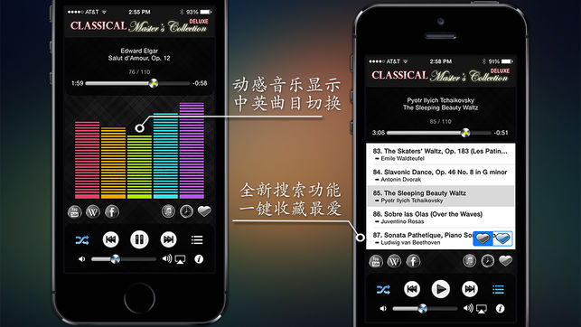 [ 全新发布 ] 在听众的强烈要求下,《古典音乐大师作品精选集二》隆重推出110首全新的,西方历史各时代中的世界经典音乐之最。每首乐曲由西方古典音乐专家精心裁剪,欧美各闻名交响乐团倾情演奏,精心制作,音质上成。让您感受音乐的震撼! 全面的最新 iOS 以及 iPhone / iPad 优化支持。 [ 精心挑选 ] 《古典音乐大师作品精选集二》选曲着重于触动灵魂以及浪漫的气氛。从李斯特的匈牙利狂想曲,柴可夫斯基的1812序曲,巴赫的小步舞曲,肖邦的小夜曲,施特劳斯的维也纳圆舞曲,爱的礼赞,月光奏鸣曲,埃及进行曲... 等110首全新的大师作品,带给您更永恒更唯美的古典音乐感受!从维也纳新年音…