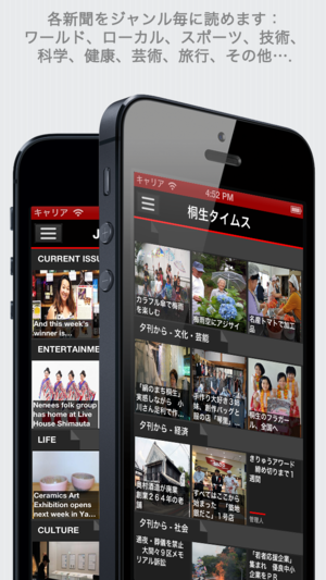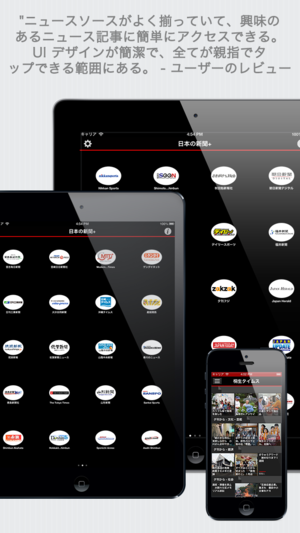日本の新聞+:日本の英語・日本語で書かれた新聞が多数。素晴らしいインターフェース。 iPhone・iPad 上のユニバーサルアプリケーション 日本の新聞: Nikkan Sports, Shimotsuke Shinbun, 秋田魁新報社, 朝日新聞デジタル, 千葉日報, デイリースポーツ, 福井新聞, Jornal International Press Japan, 読売新聞, 夕刊フジ, Japan Herald, 岩手日日新聞社, The Japan News Review, Japan Today, Japan Update, Kahoku Shimpo, Kii Minpo, 桐生…