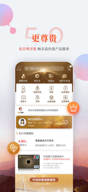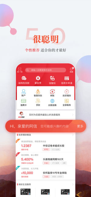 中信银行手机银行V5全新发布!中信银行手机银行提供智能语音、转账、理财、借记卡、信用卡、贷款、出国金融、私行尊享版和积分权益等一站式服务,以智能化、便捷化和极致体验为目标,推出全新视觉体验,打造有温度的手机银行。 1.【会说话】智能语音:无需动手即可免密转账,账户查询、理财、薪金煲购买一句话搞定,打造有用有趣有情的金融服务。 2.【很聪明】个性推荐:依托零售AI营销大数据算法,打造“猜你喜欢”精准推荐模式,为客户推荐最适合的的产品。 3.【享尊贵】私行尊享版:私行客户无须前往网点,直接线上购买私行产品,独享高净值权益服务,更可一键联系财富管家。 4.【更可靠】蓝牙Key:提升手机银行转账限额,…