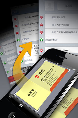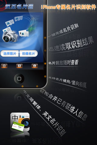 汉王名片通是一款iPhone专用的名片识别软件, 集名片拍摄、识别、编辑、保存为一体, 融合汉王最新的识别技术, 带给您超乎想象的识别速度和轻松流畅的识别体验, 帮助您快捷、高效地处理名片信息。, 操作系统 iOS 3.0及以上 产品描述 ☆ 简单迅速,一键完成名片识别 ☆ 快捷高效,迅速读取识别结果 ☆ 轻松自如,名片回放随时查看 ☆ 智能易用,识别语言自动检测 功能描述 不想拍照?也OK! —从iPhone相册中直接选择名片图像 图像拍摄?我帮您!—防抖功能让您轻松获得高质量图像 拍摄方向?您决定!—支持中英文名片的横向/竖向拍摄 编辑过程?能对照!—名片图像可以随时随地回放查看 名片更新?更快捷!—支持与已有联系人信息进行合并 我们的建议 本软件适用于:iOS3.0及以上手机,并带有自动对焦或微距摄像头 拍摄时:请将手机设备置于名片上方,尽量保持平行方向 您还可以使用免费试用版来测试汉王名片通的全部功能 您的指导 如果您是汉王名片通软件的用户,请花费些许时间留下最珍贵的评论。无论是肯定或是指导,这都将成为我们不断完善、优化产品的动力和方向。