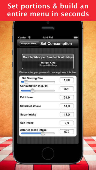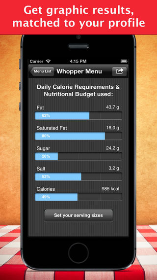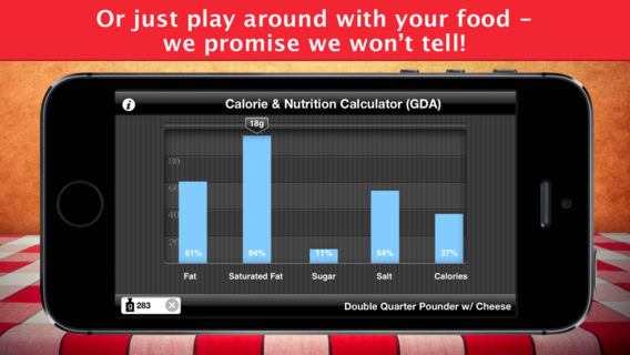 Start saving calories with every meal! This restaurant guide will help you find the best menu items to go along with your diet, stay slim and enjoy the fun of eating out healthy! This app is all about making informed choices without feeling they're a burden. It's intuitive interface assists, informs and calculates what you need to know about your next meals. » Complete menus across 90 different restaurants, including burgers, pizzas, bagels, burritos, pasta, muffins, soft drinks – even coffee or ice cream desserts! » Calorie information + nutrition charts for salt (sodium), sugar, fat & saturated fats » Nutrition info is color coded in traffic lights to guide you along towards the best items in stellar time: More greens = healthier choices » Serving size calculator included in landscape mode for each item » Create your own meals and menu items so the app can tell you their nutritional values » Check your daily nutritional requirements against what you eat: simply add a profile to know your daily calorie limits We constantly update and add new places so you always have variety and can find the best items! WHY A NUTRITION & CALORIE CHECK? We wanted to bring back the fun of eating out – just in the right way. This app will assist you in finding items you like that actually help your diet instead of piling on the pounds. No more suprises in eating out with FastFoodCheck! APP HIGHLIGHTS - Thousands of items from over 90 popular casual & quick-serve restaurants - Calorie information + color coded nutrition charts: More greens = healthier choices - Quick-pick product search across 28 different categories - Beautiful graphical calorie & serving size calculator - Interactive meal / snack management: create custom menus or build entire days of nutrition info - Create your own calorie and nutrition profile - TOP indicator for items with particularly favorable nutrition - BMI & Ideal Weight calculator now included!