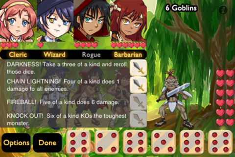 Based on the popular card and dice game of the same name. Single player fantasy dice game with a very light tone. Roll straights, full houses, and matching sets to activate your party members' powers. Beat up the monsters until you get to their boss. Uses keep-some-reroll-the-rest mechanic common to many popular dice games. Has Game Center Achievements to unlock. 8 characters and 5 quests. A quest can take 5-15 minutes depending on how many times you get bopped on the head.