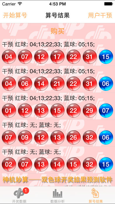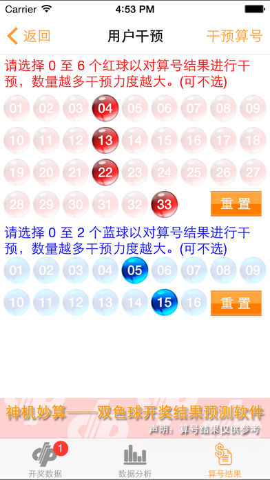 神机妙算 - 双色球算号软件 专业版 本软件可自动获取中国福利彩票双色球开奖结果 可查看每期中奖人数 金额 以及 奖池信息 可对结果数据进行分析 得出每个号码出现次数,概率,频率等可靠数据。 可对数据进行科学分析,算出下期可能的开奖结果。 用户可以添加自己的号码对算号结果进行人为影响。 更多功能将在后续更新版本中加入。 本APP属娱乐用。切勿完全相信算号结果。