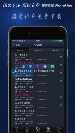 发布七年来第一次免费,第一次限免!!! App Store六大之最铃声软件! 我们的目标是做最专业、功能最强大、用户体验最好的铃声软件!一句话就是行业第一! 一、技术最先进、功能最强大的铃声软件 1.铃声在线试听,边试听边下载同步进行。这样做的好处是当网速不好的时候用户不用等待下载完整首铃声之后才能试听。 2.编辑铃声时支持多种特效:淡入淡出,男女声互变(变调),变速。大大增加铃声的趣味性。最重要的是这些特效可以实时动态调整(边播放边调整),不用每次重新播放,这个技术目前在app store上没有人可以超越。 二、下载量最大的铃声软件 手机铃声是app store铃声类软件中最受欢迎的Ap…