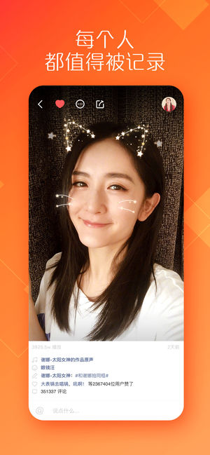 「有趣视频,一看就上瘾」 好看的、好玩的,好笑的短视频,都在这。 「疯狂k歌,金曲任你唱」 海量流行热门金曲,全都有;想唱就唱,轻松做麦霸。 「一起同框,越玩越有戏」 随时随地多人同框,搭戏模仿,有趣更有戏。 「互动直播,有你更出众」 随时随地侃大山,好看的小哥哥小姐姐都爱玩的直播在这里。 「支持原创,潇洒做自己」 脑洞大、才艺多,有绝活,给你大舞台。 「美颜滤镜,拍出你的美」 30款美颜滤镜,上百种魔法表情;要萌要酷随你变,怎么变都好看。 众多热门综艺节目认证,超好玩的短视频社区。 《快乐大本营》何老师认证最亲密合作伙伴; 《声临其境》声音大咖首推短视频; 《明日之子》小哥哥魔法…