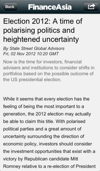 FinanceAsia is the region’s most authoritative source of independent, accessible financial news, with analysis and insight into Asia’s capital markets. Established in 1996 as a monthly publication, FinanceAsia is for driven finance industry professionals who need authoritative deal information and capital markets intelligence from across Asia, to help them gain a professional edge in a fiercely competitive sector. FinanceAsia - Daily news & headlines plus the magazine highlight 12 months subscription (US 349.99) 12 months of daily news & headlines 30 days access (US 44.99) 30 days of daily news & headlines Remark: -Purchasing the FinanceAsia iphone/ipad app via Apple does NOT automatically give you access to our ONLINE website. To access FinanceAsia across all platforms subscribe to our FULL package on our website and log in to the iphone app and ipad app for free. - Payment will be charged to iTunes Account at confirmation of purchase - Subscription automatically renews unless auto-renew is turned off at least 24-hours before the end of the current period - Account will be charged for renewal within 24-hours prior to the end of the current period, and identify the cost of the renewal - Subscriptions may be managed by the user and auto-renewal may be turned off by going to the user’s Account Settings after purchase - No cancellation of the current subscription is allowed during active subscription period - Terms and condition :http://www.financeasia.com/Page/Terms.aspx - Privacy Policy :http://www.financeasia.com/Page/Privacy.aspx