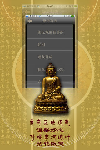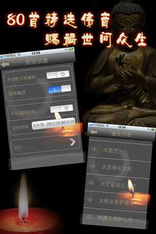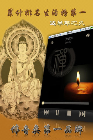 ★累计排名生活榜第一达半年之久!累计排名总榜TOP 50达8个月!App Store佛音产品第一品牌!★ --------------------------------------- 佛说:“八万四千法门,无非应众生种种症结而对症下药,应种种时节因缘而因机施教。” 在佛法流传的历史长河中,佛教音乐梵呗象一朵朵美丽的浪花,在庄严佛法的同时,也以其独特的表达方式,启迪广大有情趋向觉醒,接应无量众生走向解脱。 ------------------------------------ 佛教音乐不同于世间音乐,世间音乐多有声嘶力竭的发泄,佛乐却让我们的灵魂干净和清凉。世间音乐多有对迷情和贪恋的盲目歌颂,佛乐却启发众生从红尘迷梦中彻底觉醒。世间音乐多以离愁别绪助长人心的执著,佛乐中的咒音却对众生消除业障烦恼有不可思议的加持。世间音乐多有对人生痛苦的无奈和叹息,佛教音乐却当下直指众生离苦得乐的菩提之路。 本合集精选收录70首佛教音乐,清净您的心灵,赐福世间众生! ------------------------------------ 佛音列表: 阿弥陀佛心咒 八十八佛大忏悔文 白度母心咒 白文殊心咒 般若波罗密多心经 般若心咒 禅悦 慈心相系 妙法莲华观世音 吃斋念佛 大雄宝殿 大悲咒 大吉祥天女咒 大孔雀明王心咒 大势至菩萨真言 地藏王菩萨心咒 地藏经 点一盏心灯 观音普门品 观音灵感真言 观音菩萨在心中 观音咒 海上莲花 黄财神心咒 金刚萨埵百字明咒 金刚手菩萨心咒 极乐歌 南无观世音菩萨 轮回 莲花开放 莲花生大士心咒 六字真言 美丽的咒语 梦幻人生 弥陀赞 莫生气 毗卢遮那佛心咒 菩提本无树 菩提心愿 清净法身佛 如意宝轮王陀罗尼 生活禅曲 十小咒 释迦牟尼佛心咒 受用功德 水琉璃 文殊咒 文殊菩萨心咒 无量寿如来陀罗尼 消灾吉祥咒 心静如水 心月 虚空藏菩萨咒 雪域光芒 因果 云水吟 药师佛心咒 药师灌顶真言 一句阿弥陀佛 一切随缘 愿洒一池功德水 庄周梦蝶 准提神咒 拜愿 观音灵感歌 静虚吟 六字大明咒 三宝歌 戒定真香 祈福 佛陀圆舞曲 千手千眼 清静法身佛 感悟人生 ------------------------------------ 特色功能: 1、连续播放:章节播放完毕,自动播放下一章节,适合连续收听。 2、定时关闭:设定关闭播放时间,时长分为5分钟、25分钟、60分钟,到时自动关闭播放。适合夜晚睡前收听。 3、后台播放:可转入后台播放状态,收听操作两不误。 ------------------------------------ appjourney微博平台全面开通,我们将在微博中开展各类活动,每位关注appjourney微博的用户均有机会赢得推广码! 新浪微博 http://weibo.com/appjourney 腾讯微博 http://t.qq.com/appjourney ------------------------------------