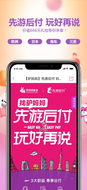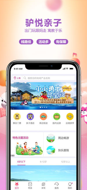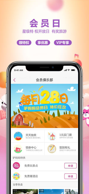 找驴妈妈,先游后付,玩好再说 即刻启程,遇见惊喜,双旦出游享最高1000元大礼; 每周末门票真五折,去你想去的! 每月会员日,特权豪礼任意选,0元旅游等你来; * 下载有礼:下载并登录驴妈妈新版客户端,即送880元优惠券; * 欢乐门票:下单立减,最高减50元; * 周边游:周边温泉季,首泡五折起; * 酒店:优化搜索,更便捷的找到心仪的酒店; * 国内:国内提前购,最高立减500元; * 出境:出境预售,享高额立减; * 机票:热门航线,想飞就购; * 火车票:分享最高可获20元出行红包; * 汽车票:随心出游,旅行更自在; * 驴悦亲子游:出门玩,跟妈…
