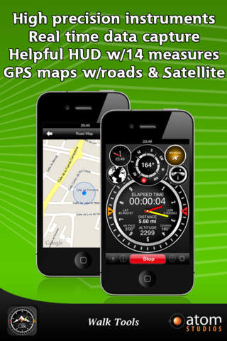 *** TOP 10 IN 60 COUNTRIES *** *** Featured as 'New and Noteworthy' by Apple *** From the creators Bike Cyclocomputer HUD (featured by Apple as ‘New and Noteworthy’) comes Walk Tools. Walk Tools is the best solution for getting info of your hike or walk. This app gives you all the data you need to know exactly how you are performing your excersise. Walk Tools gives you a plethora of high precision instruments, especially designed for getting the most of your hike: Compass, Elapsed Time, Distance, Analog Clock, Digital Clock, Pace, Lattitude, Longitude, Altimeter, Course, and GPS Signal power in a simple and beauty app that will be the perfect companion for you. Those instruments have been callibrated specially for walking or hiking so that you never miss again any valuable information. MAIN FEATURES: Ultra high precision instrumets Callibration made for walking or hiking 60 frames per second animation Accurate calculations Automatic zoom enabled map. Keeps you always centered on the map TECHNICAL FEATURES High precision GPS Nice Start/Stop sounds Beauty Retina Display graphics Autozoom English and Metric units settings Multitasking ON/OFF setting to save battery INSTRUMENTS Compass Elapsed Time Distance Analog Clock Digital Clock Pace Lattitude Longitude Altimeter Course GPS Signal power PLEASE NOTE: For using this app, you must have a GPS and compass equipped device, such as an iPhone 3GS or an iPhone 4. This application is NOT RECOMMENDED FOR IPOD TOUCH, NON-3G IPAD OR 1ST GENERATION IPHONE devices due to their limited hardware capabilities.