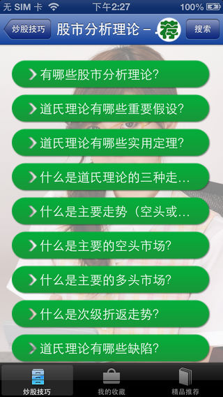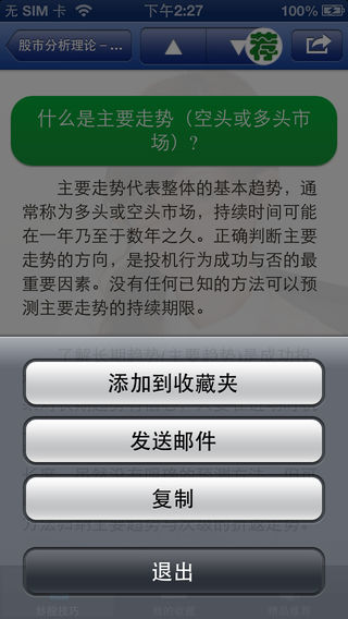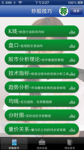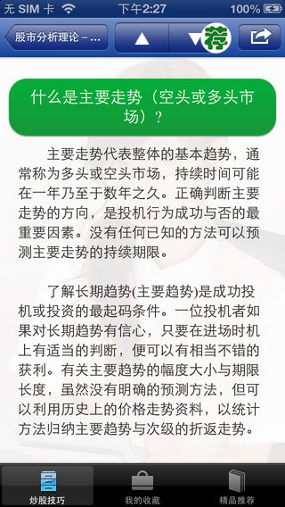 做看盘的高手,成抓涨的赢家。 炒股不会看盘,相当于盲人摸象——“400招”让你轻松学看盘。 操盘不懂抓涨,相当于乱点鸳鸯——“400招”教你抓涨真秘诀。 本软件以一问一答的形式,将看盘时必须注意的问题一一罗列出来,内容上图文并茂,形式上简单明了。目的是用最有效的方式,使用户在最短的时间内掌握看盘知识,助您成功抓涨,纵横股市! ------------------------------------ appsbooks开微博啦!马上关注我们的微博,大家都有机会获得推广码免费体验! 新浪微博 http://weibo.com/2185148310 搜狐微博 http://t.sohu.com/u/151680248 腾讯微博 http://t.qq.com/a888999-gao ------------------------------------