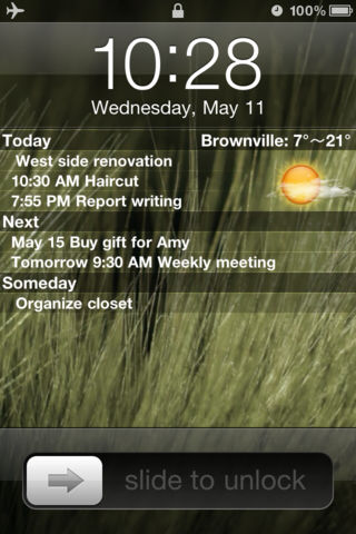 *******ON SALE 50% OFF FOR LIMITED TIME******* Make LockScreen (To-do List & Weather) is a powerful yet easy to use task manager for your daily life. Addition, use LockScreen To-do, you can customize your iPhone's lock screen to display todo list and current weather. Features: * Smart listings. * Pre-alerts. * Sound notification. * Live app badge updating. * Smart lock screen wallpaper maker. * Hi-Res graphics for retina display. * Predefine 100+ HD wallpapers for iPhone 4 (640 * 960). * Support 80,000+ different weather locations. ********************************** How to set Lock Screen Settings -> Wallpaper -> Camera Roll -> Choose image -> Set -> Set Lock Screen