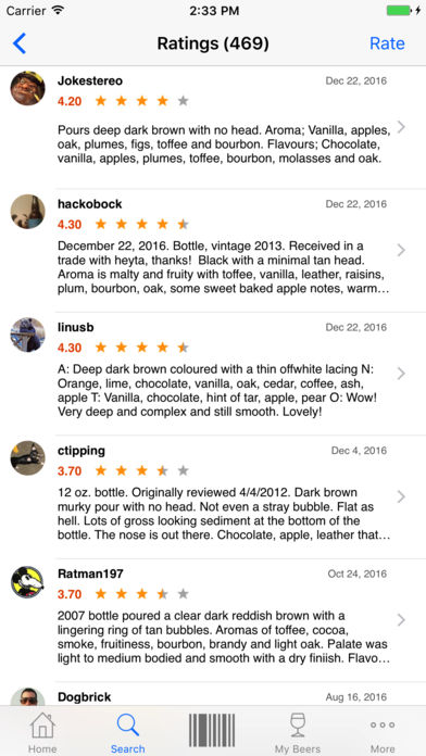 •• #1 Beer App on App Store •• ••• Voted to Men's Journal Top Apps ••• Over 300,000+ beers and millions of user reviews at your fingertips. Browse and rate beers from every brewery, as well as find nearby stores, restaurants and bars all serving and selling beer. Ever walk into a beer store and want to find out more about a beer? Sitting at a bar and see something intriguing on tap and you want to find out more? Want to see millions of ratings and reviews of you favorite craft beers? ••Barcode Scanning•• Beer Buddy allows you to use your device's camera to scan UPCs (barcodes) from beer bottles, cans, and cases, to obtain vital information pertaining to that particular beer. Discover history, alcohol content, user reviews, the brewery behind the beer, and much more all from scanning a barcode. If it happens that your beer has not been found via barcode scanning, add it to our vast database or search for it by name. ••RateBeer.com Integration and Reviews•• With Beer Buddy you will be able to actively interact with the web’s most complete beer database at ratebeer.com. With more than 300,000+ beers, and more being added everyday, the ratebeer.com database is at your fingertips. Many beers in the database can now be scanned, found, rated and shared. Users that have a ratebeer.com account will be able to write and post reviews to the website directly from Beer Buddy. Users will also be able to synchronize their ratebeer.com ratings to their device for later offline viewing. All users will have the ability to read reviews from ratebeer.com and see categorical scores for taste, aroma, palate, etc. ••Beer Finder•• “Beer Finder”, innovative enough to be an app by itself has been seamlessly integrated into Beer Buddy. Search for beers by name using Beer Buddys' intuitive auto complete search. You now have the ability to search the top beers in every country, the best seasonal beers, and RateBeer.com’s Top 50 list. Ever wonder what the top beer is in the United States, South Africa or any other country in the world?? Now you have that ability in the palm of your hands. ••Places•• Beer Buddy allows you to tap into a huge database of restaurants, beverage stores, bars, and breweries that serve your favorite beer. Using Places you can find these spots based on your current location, searching by name, or searching by address. Never go thirsty again! ••Beers On-Tap•• The “On Tap” feature is a new idea in beer apps that allows you to compose a list of beers you have not yet tried but would like to in the future. Now you can find a beer and add it to a list, read up on it, find beers from the same brewery and get a ton of other information. Beers “On Tap” can be easily transferred to your favorites or tasted list and reviewed. ••Favorites List•• Beer Buddy will also allow you to make a list of your favorite beers. Your favorites list will give you the ability to rank and rate your beers. With addition of new ales, porters, stouts, ciders, and more your favorites list can seamlessly be edited. Integration with social media such as Facebook and Twitter. This is by far the most comprehensive beer app out there, and will be your buddy to finding, drinking and rating beer. The app is directly integrated with ratebeer.com so you can read reviews of any beer and locations (retailers, bars, and breweries), as well as provide your own ratings...You can start by either searching for the name of the beer or scanning the barcode. Once you find your beer, you can bookmark it for later via the “On Tap” function. -- GigaOM.com