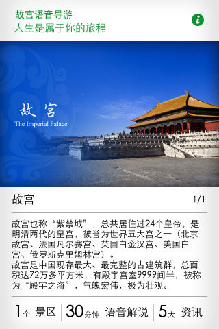 故宫,也称紫禁城,是世界上现存最大、最完整的宫廷建筑群,是无与伦比的中国古典建筑典范,也是北京甚至全中国最重要的旅游目的地之一。 北京导游高清手绘系列故宫语音版,采用手工绘制的精美导游图,全景式展现故宫内各景区的建筑风格、历史故事、文化背景等方方面面,更有众多交通指南、游览资讯等贴心小提示,让您充分体验到专业导游的顶级服务,省时、省力、更省心! 故宫语音版,主要功能有: 1、可随意缩放的高清手绘导览图,帮助您快速规划游览路线; 2、20个景点的详细介绍及精美图片,让您直观全面了解故宫的历史文化; 3、每个景点均有专业人士全程语音详细解说; 4、景点的查询和跳转; 5、丰富的旅游资讯,包括交通出行、开放时间、票务政策、服务设施等,为您考虑到旅游中每一个细节。 私人导游陪你走进皇城,细数风云历史。