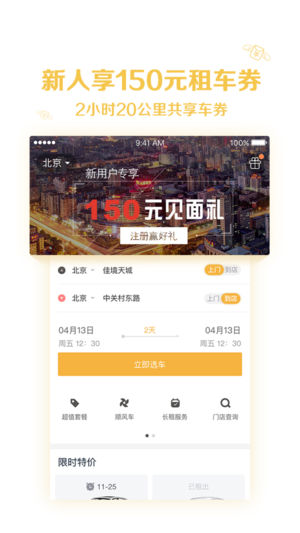 神州租车新用户得150元券、2小时20公里共享车券,免预授权免违章押金,智能取还,周周有新车,月月有爆款特价,全国5000+网点,7*24小时服务。TEL:400-616-6666