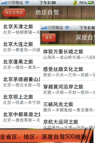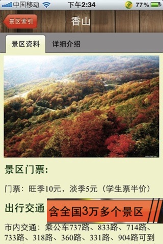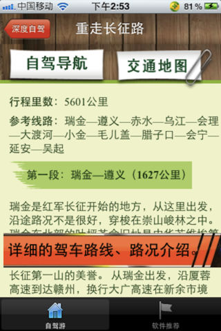最新增加2012国庆长假自驾游信息(包含全国3万多个景点详细信息。) -------------------------------------------- 精选500条自驾游线路 一、线路特色 ★自驾导航:每条线路都有详细的驾车线路行程安排指导,走哪条高速公路、从哪里下高速,以及行程中的路况提示。 ★地图导航:我们精心为你把整个行程的线路,以GPS地图行式展示出来,地图中包括:高速路名称、出口、加油站、收费站等,让你一目了然。 ★景点介绍:每段行程最后都是以景点为中心,所以我们把每条线路景点都作了详细介绍。 二、自驾游线路安排 1、深度自驾 包含了全国最适合自驾的精品线路,这些游路集中了中国最优秀的旅游景点 2、地区自驾 (长线自驾) 我们为您挑选了华北、华东、华南、西北、西南5个地区的跨省自驾游线路。 3、省区自驾(短线自驾) 包含全国34个省的300多条精选自驾线路,这些线路都集中了每个省的最精华的精点。 三、最全的全国景点大全 我们收录了全国近3万多个景点,就连你周围的小公园也在其中哦。每个景点我们都有:景点图片、景点介绍、门票及价格、开放时间、联系方式等,方便你查询。